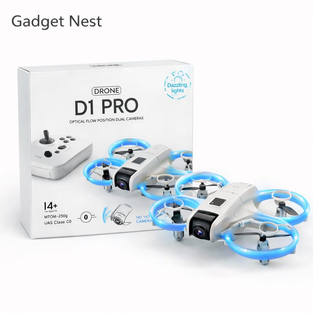 The GNH D1 PRO Drone is a compact and stylish flying drone specially designed for beginners and hobby users. It features dual cameras for capturing fun aerial photos and videos, while optical flow positioning helps maintain stable hovering for better control. Its bright LED dazzling lights give it a premium futuristic look, making night flying more attractive.